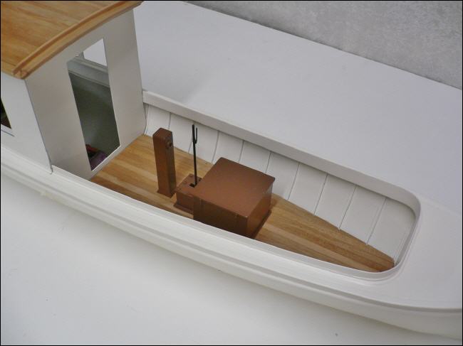 Der Motorkasten erhielt seitlich noch vier Verschlüsse für den Deckel und der Getriebekastendeckel acht Stehbolzen mit Verschraubungen. Um ein wenig Farbe ins Boot zu bekommen, wurden die Teile nussbraun lackiert. Dies stellt einen schönen Kontrast zu dem ganz in weiß gehaltenem Boot dar.