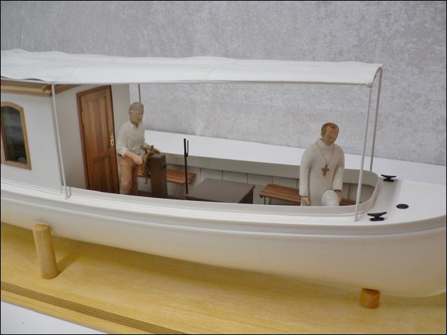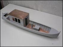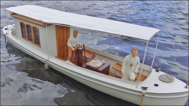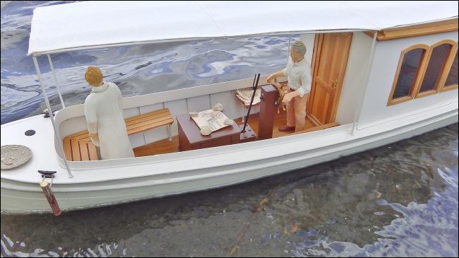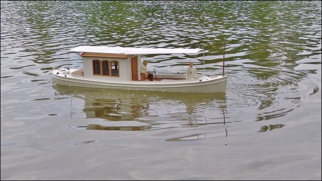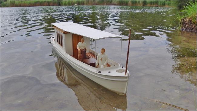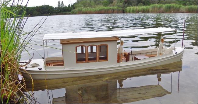 Bau: Anhand der Maße und den vorliegenden Fotos wurde zunächst der Plan konstruiert. Der Aufbau ist recht einfach gehalten und sollte keine Schwierigkeiten bereiten. Hauptmerkmale sind die recht große Kajüte mit ihren sechs Fenstern und natürlich das Sonnensegel.