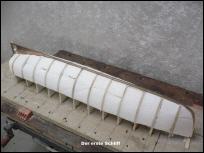 Zuerst erfolgte der Bau des Mallgerüstes, also das Setzen der 6mm Spanten kopfüber auf der Helling. Zwischen den Spanten wurden Styroporplatten geklebt. Sie dienten zum Straken der Spanten und als Formgebung des Rumpfes.