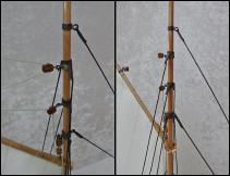 Endlich konnte mit den Lackierarbeiten weitergemacht werden. Nachdem nunmehr der Rumpf soweit durchgetrocknet war, erfolgte das Anbringen des Holzprofils für die Relingstützen, die Wanten- und Stagspanner, die Welle mit Antriebseinheit, sowie das Ruderservo.