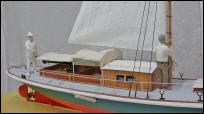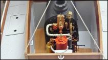 Dem „Paulus" fehlen nur noch die Maschinenanlage und die Besatzung. sowie einige Kleinteile. Als erstes wurde der Kessel aus 0,5mm FR-4 gebaut. Danach kamen die Ventile und Verschraubungen der Rohrleitungen an die Reihe. Der Kreuzkopf der Dampfmaschine wird in zwei seitlich angeschraubten Führungen gehalten. Die Umsteuerung erfolgt mit einem losen Excenter, der sich am Ende der Kurbelwelle befindet. Umgelegt wird dieser mit einem langen Hebel. Seitlich des Zylinders befinden sich noch der Kondensator (Backbord) und die Speisepumpe auf Steuerbord. Nur gut, dass nichts funktionieren muss. Nach dem Zusammenbau folgten das Verbinden der Rohrleitungen mit dem Kessel und der Einbau in den Schiffsrumpf. Durch den Schornstein des Kessels wird die gesamte Einheit mit einer Inbusschraube befestigt. Die komplette Maschinenanlage benötigte rund sechs Wochen Arbeitszeit.