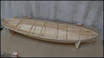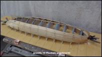 Zuerst erfolgte der Bau des Mallgerüstes. Nach dem Straken der Spanten wurde der falsche Kiel mit dem Vorder- und Achtersteven angebracht. Die Mallen erhielten Klebebandstreifen um ein anhaften der Planken zu vermeiden. Dieses Mal bestehen diese aus Gewichtsgründen aus 3x7mm Balsaholzleisten. Die Beplankung erfolgte in gewohnter Art und Weise, und nach einigen Tagen war der Rumpf geschlossen.