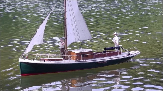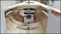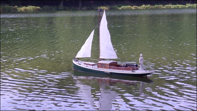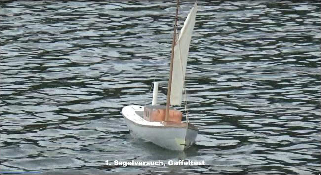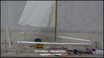 Auf einem Montagebrett wurden die Komponenten Mast, Gaffel mit Segel, Holepunkte und die Winde so montiert wie sie später auch im Rumpf verbaut werden sollen. Nach drei Tagen fluchen, fummeln, ändern, ergänzen und verbessern war ich dann mit dem Ergebnis sehr zufrieden. Im „Windkanal“ (Ventilator) wurde das Umlauf/Endlosschot getestet. Nach Einbau in den Rumpf erfolgte die Bewährungsprobe am See.