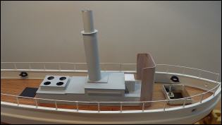 Maschinen- und Kesselhaus Der nächste Bauabschnitt war der Aufbau Mittschiffs aus 0,5 mm FR-4. Im hinteren Teil befindet sich das Maschinenhaus mit Oberlicht, dann folgen das Kesselhaus mit seitlichen Wartungsluken und davor der Steuerstand (Einheit 51 Gramm). Der Schornstein selbst besteht aus dünnwandigen Alurohr und hatte eine Wärmeschutzverkleidung. Diese wurde aus einem passenden Kunststoffrohr hergestellt. Nachdem nunmehr alles fertig war, erschien mir der Aufbau mit seinen 51 Gramm doch als zu „schwer“. Also noch einmal ganz von vorne, aber diesmal mit 0,8 mm Flugzeugsperrholz. Und siehe da, jetzt wog er nur noch 16 Gramm!