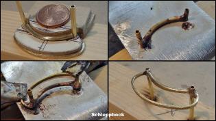 Schleppbock mit Haken Er befindet sich zwischen Oberlicht und Schornstein. Gefertigt aus Messing wurde der Schleppbock fest mit dem Aufbau verschraubt. Für das Biegen einzelner Teile wurde eine Schablone hergestellt und auf einer Löthilfe hart verlötet Geplant ist noch der Bau eines Leichter, der später vielleicht mal vom Schlepper gezogen werden soll. Aber das ist Zukunftsmusik.