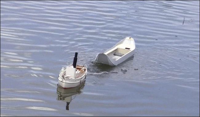 Erste Probefahrt Bald fand die erste Probefahrt des „Dollmann“ im Ika-See statt. Beladen mit rund 450 Gramm Blei wurde er an den Schlepper „Pfeil“ angehängt und gezogen. Klappte wirklich gut, man darf lediglich nicht zu enge Kurven fahren. Der „Pfeil“ hatte keine allzu große Mühe den Schleppkahn zu ziehen. Ein vorsichtiges abstoppen ist ratsam, damit der Kahn nicht hinten drauf fährt, so wie es auch in Wirklichkeit passiert war. Das montierte Balance-Wipp-Ruder mit seiner Befestigung bewährte sich hervorragend. Jetzt konnte es mit vollem Elan weitergehen.