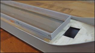 Kastenaufbau: Nachdem nunmehr der Rumpfbau als solcher geschlossen war, konnte mit dem Kastenaufbau begonnen werden. Wie bereits schon geschrieben, war dieser mit abnehmbaren Wellblechen abgedeckt. Die Führungsschienen bestehen aus übereinander geklebten 0,6 x 6,0 mm und 0,6 x 3,0 mm Flugzeugsperrholzstreifen und können die Wellbleche paarweise aufnehmen.