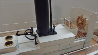 Maschinen- und Kesselhaus Der nächste Bauabschnitt war der Aufbau Mittschiffs aus 0,5 mm FR-4. Im hinteren Teil befindet sich das Maschinenhaus mit Oberlicht, dann folgen das Kesselhaus mit seitlichen Wartungsluken und davor der Steuerstand (Einheit 51 Gramm). Der Schornstein selbst besteht aus dünnwandigen Alurohr und hatte eine Wärmeschutzverkleidung. Diese wurde aus einem passenden Kunststoffrohr hergestellt. Nachdem nunmehr alles fertig war, erschien mir der Aufbau mit seinen 51 Gramm doch als zu „schwer“. Also noch einmal ganz von vorne, aber diesmal mit 0,8 mm Flugzeugsperrholz. Und siehe da, jetzt wog er nur noch 16 Gramm!