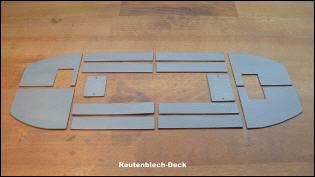 Wellblechabdeckung Das Wellblech besteht aus Polystyrol, hat einen Wellenabstand von 2,0 mm und eine Dicke von nur 0,5 mm. Gebogen wurde es über Schablonen und dabei ganz vorsichtig erwärmt um es in Form zu bringen. Bei der Probemontage musste ich leider feststellen, dass sie doch nicht so ihre Form behielten wie ich es mir vorgestellt hatte. Deshalb wurden sie zur Stabilität auf 0,4 mm Sperrholzplatten geleimt, die über Formstücke ihre Rundung behielten.