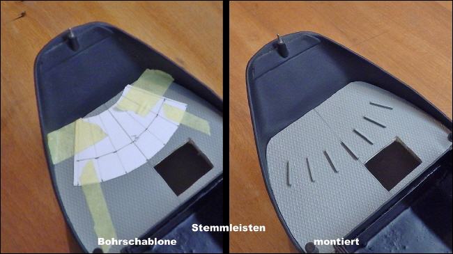 Für die Beplankung wurde 1,00 mm Flugzeugsperrholz genommen. Für die beiden Kaffen entstanden zuvor aber erst Pappschablonen. Nach diesen wurden sie mit Flugzeugsperrholz beplankt. Für den Übergang und verkleben zum Mittelsektor wurden die Platten auf 0,5 mm mittels Kreissäge in ihrer Dicke halbiert.