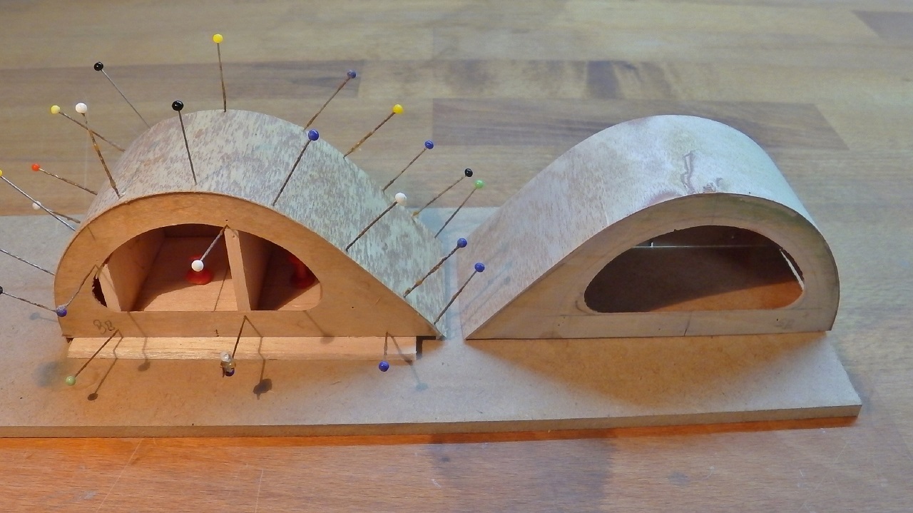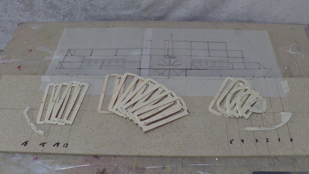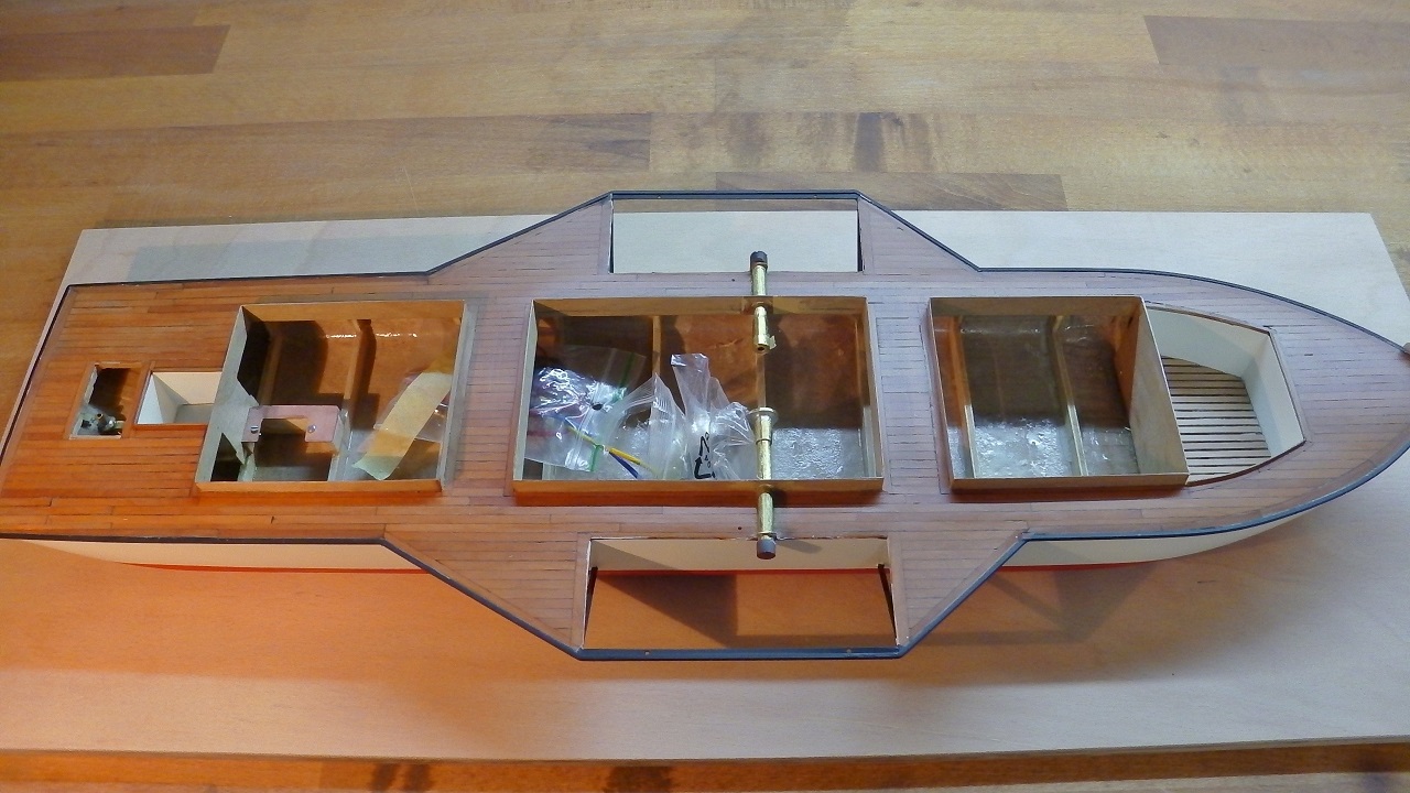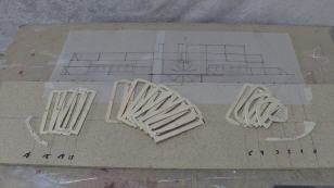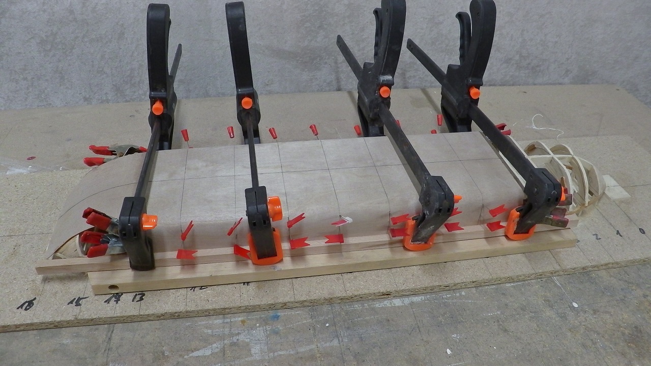 Zuerst wurden die fünfzehn Spanten und die beiden Steven aus 3,00 mm Pappelsperrholz ausgeschnitten und wie üblich über Kopf auf ein Montagebrett ausgerichtet und verklebt. Dieses Mal waren sie innen ausgesägt, da sie stehen bleiben sollen. Die Bug- und Heck-Partie wurde teilweise mit Balsaholzleisten als Füllungen versehen und als Beplankung 0,4 mm wasserfest verleimtes Flugzeugsperrholz verwendet. Laminiert wurde mit 49 g Glasgewebematte.