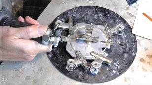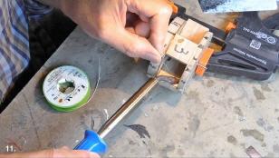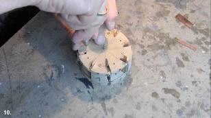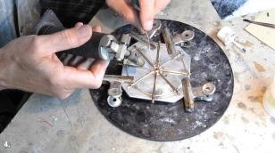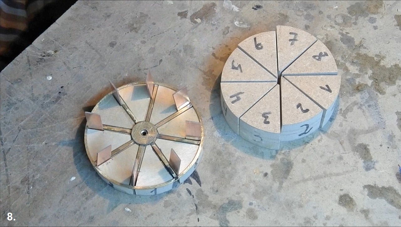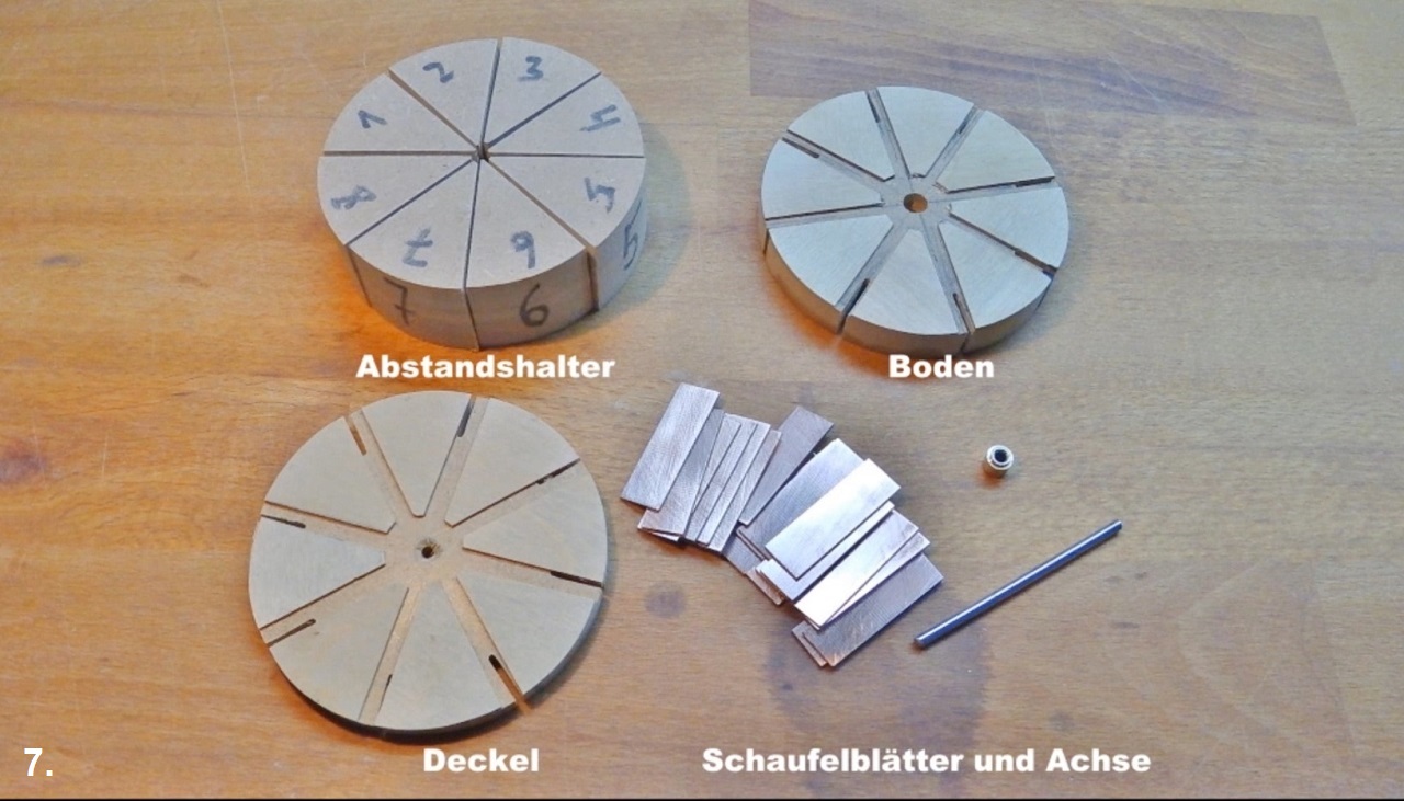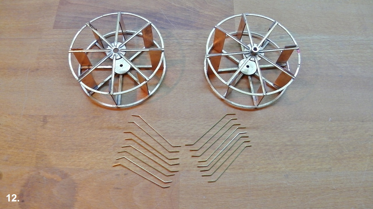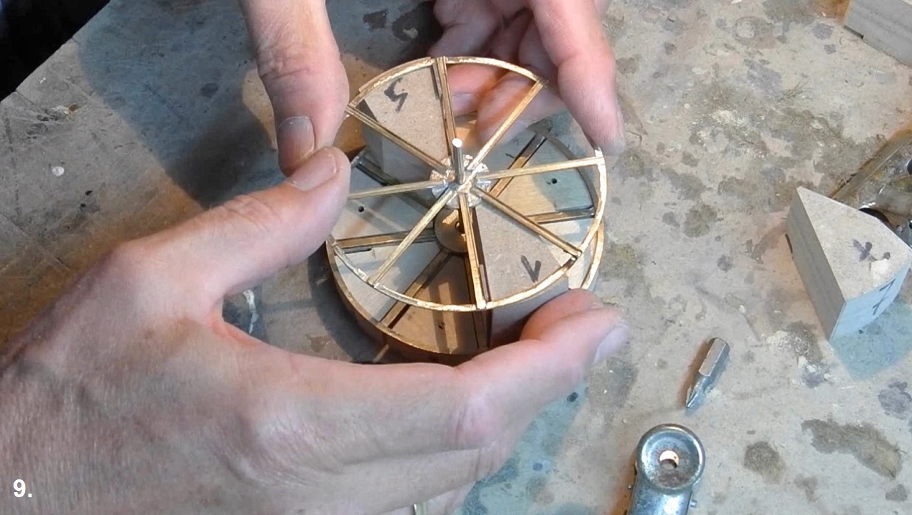 Um einen gleichmäßigen Abstand der Räder zu erhalten, fertigte ich mir eine Distanz- und Montage-Vorrichtung an. Die acht Schaufelblätter lötete ich weich an die Speichen.