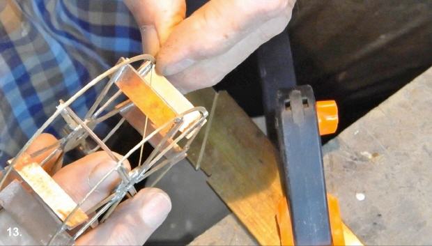 Montage der diagonalen Verstrebungen. Auf der Arbeitsplatte das Messingblech als Biegeschablone der Verstrebungen.