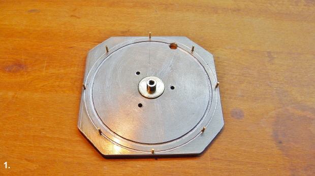 Ein 5,00 mm starkem Alu-Blech diente als Schablone zum Biegen der Radkränze und der Montage der Speichen. Eine passende kreisförmige Nut wurde so gedreht, dass der Radkranz hineingelegt werden konnte. Außerhalb davon kamen acht Löcher mit Haltestiften zum Fixieren der Speichen, ebenso mittig eine Aufnahme für die Radnabe (liegt schon mal drin).