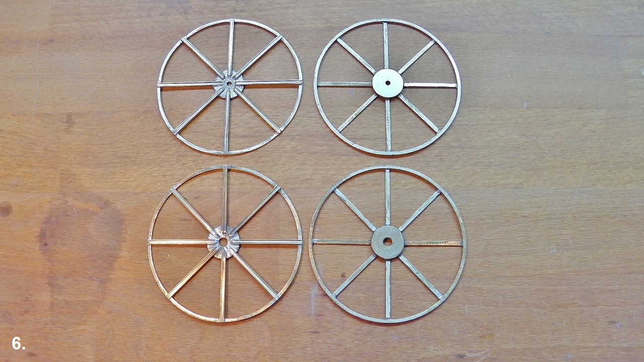 Die flachen U-Profile der Speichen erhielten 1,6 mm Bohrung und wurden für das Löten mit den Haltestiften fixiert und an dem Radkranz und der Nabe verlötet. Als die Radsterne soweit fertig waren, wurden sie mal auf die Antriebswelle des Modells gesteckt. Hier konnte ich weitersehen und die noch erforderlichen Maßen abnehmen (Foto 6a).