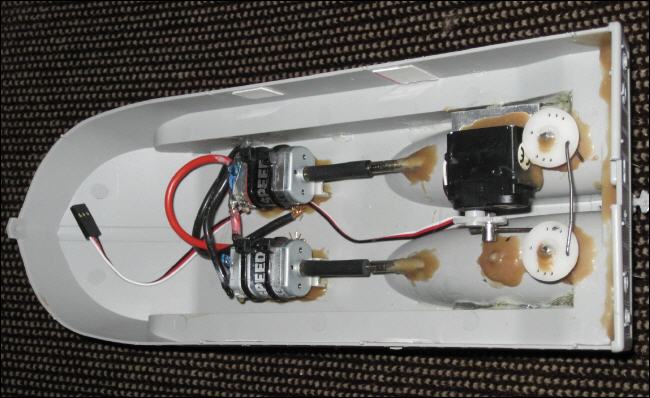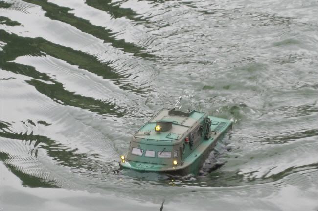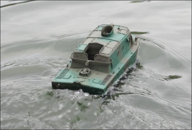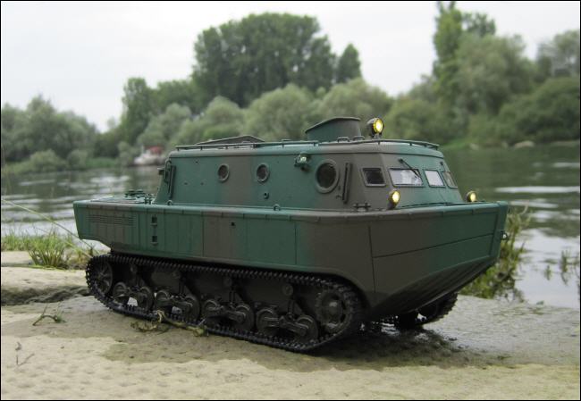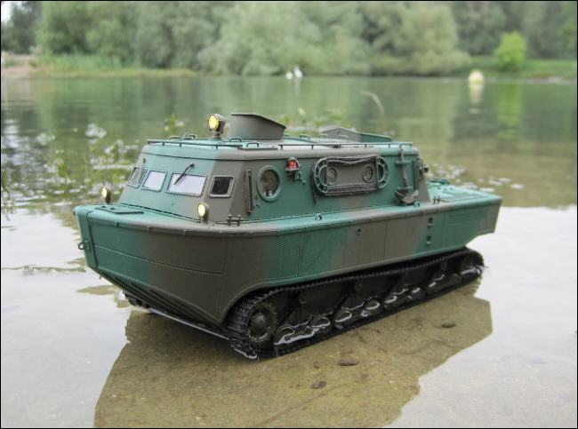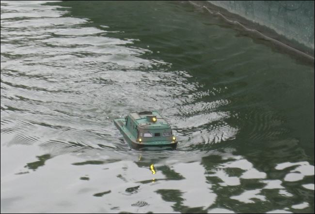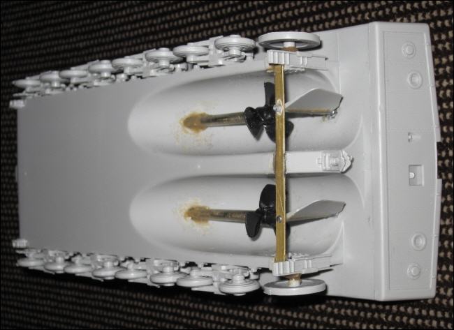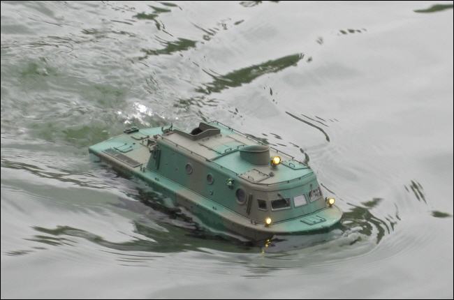 Modell: Das Polystyrol-Modell ist ursprünglich nicht für RC vorgesehen, aber die verwendeten Komponenten passen ideal für den Einbau. Es blieb sogar Platz für die Teilweise Nachbildung des Innenraumes mit Amaturenbrett Beleuchtung. Die Positionslampen sowie die Scheinwerfer sind mit LEDs beleuchtet. Ein Antrieb der Ketten schied von vornherein aus, da die Kunststoff-Fahrwerks- und Ketten-Teile dafür durch Metallteile ersetzt werden müssten und damit das Modell für den Wassereinsatz zu schwer würde. Die Ruder wurden an Stahlwellen montiert und erhielten Gegenlager aus Messing. Mit den beiden Motoren ist das Modell kräftig genug um auch bei leichter Strömung auf dem Rhein eingesetzt zu werden. Da die Motoren nicht getrennt angesteuert sind, ergibt sich nicht zuletzt durch die nicht gerade strömungsgünstige Form des Unterwasserschiffes ein recht großer Wendekreis. Ein weiterer Landwasserschlepper sowie passende Pontons sind in Planung.