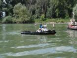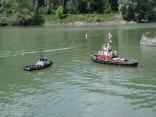 Auch durften die Kapitäne der Feuerwehr-Boote ihr Können unter Beweis stellen. Auf einem Schubleichter war „Ladung“ explodiert und in Brand geraten, welche gelöscht werden musste.