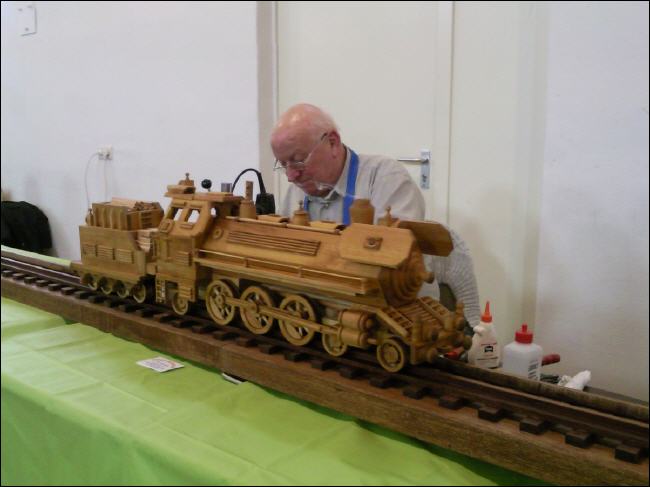 Direkt neben dem Eingang gab es eine aus Holz geschnitzte Dampflok zu sehen. Selbst die Schienen dazu waren aus Holz. Die Lok fuhr den ganzen Tag zwischen zwei Prellböcken hin und her. |