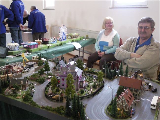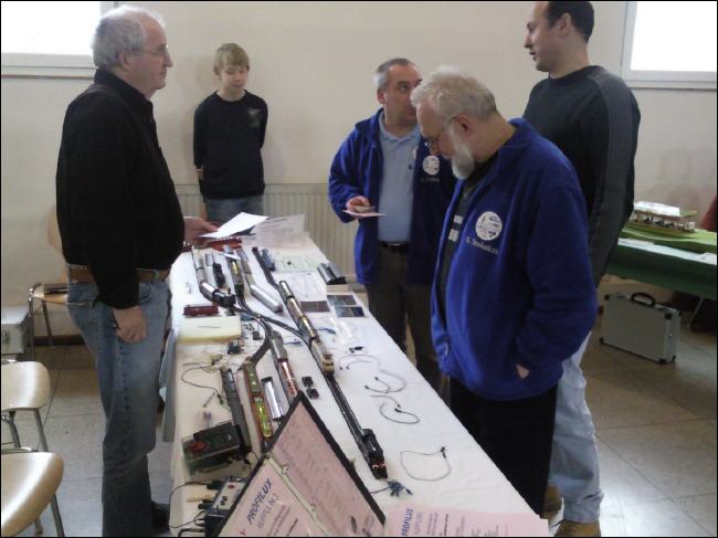 Mein erster Weg führte mich dann zum Stand vom Dipl. Ing. Heiko Wulf. Dieser stellt stromführende Kupplungen und Innenbeleuchtungen für Wagen und Loks in HO her. Es galt unsere bestellten Umbauten (neues stromsparendes Licht und Pufferschaltung gegen das Flackern) zu begutachten. Herr Wulf führte uns seine Kreation vor und wir waren restlos begeistert. Kein Flackern und ein gleichmäßiges warmes Licht im Waggon. Stromverbrauch ungefähr bei 10 mA. Dieser Hersteller ist unbedingt zu empfehlen. Durch seine sachliche ruhige Art zeigt er einem, immer wieder, neue Möglichkeiten auf um den Modellbetrieb dem Original anzupassen. Zudem sind seine Preise äußerst fair. |