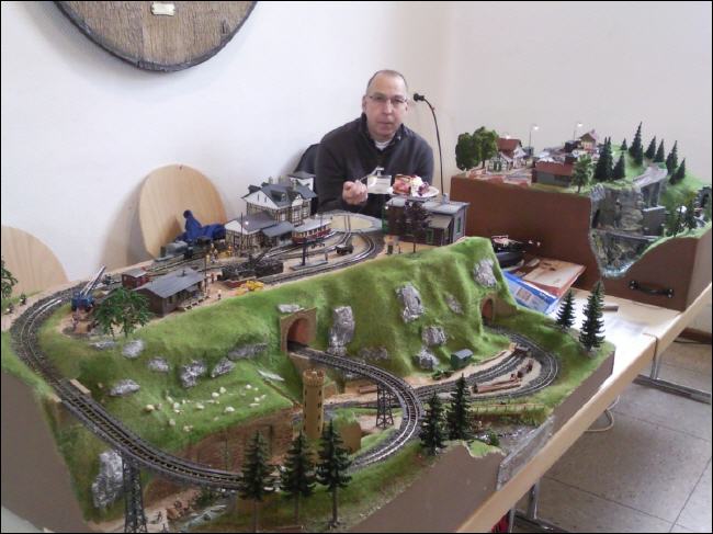 Walter Salomon aus Worms und Stefan Lang aus Neustadt zeigten ihre Feldbahnen. Diese kleinen Anlagen sind vom Gleisbild ähnlich aufgebaut aber von der Gestaltung total unterschiedlich. Hier sah man aber die Liebe zum Detail. |