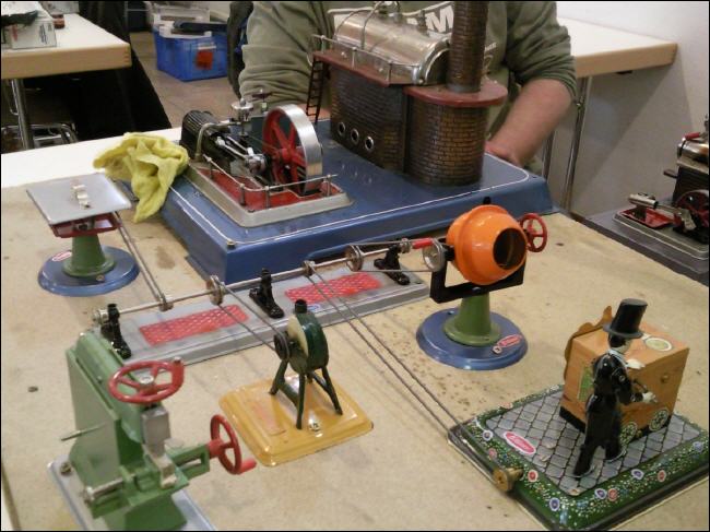 Gegenüber gab es noch eine aktive Dampfanlage zu sehen. Die älteren Modellbauer kennen diese Art noch. Gab es sie doch fertig zu kaufen. Geheizt wurde sie mit Esbit. Dazu gab es die verschiedenen Geräte, die von der Dampfmaschine angetrieben wurde. |