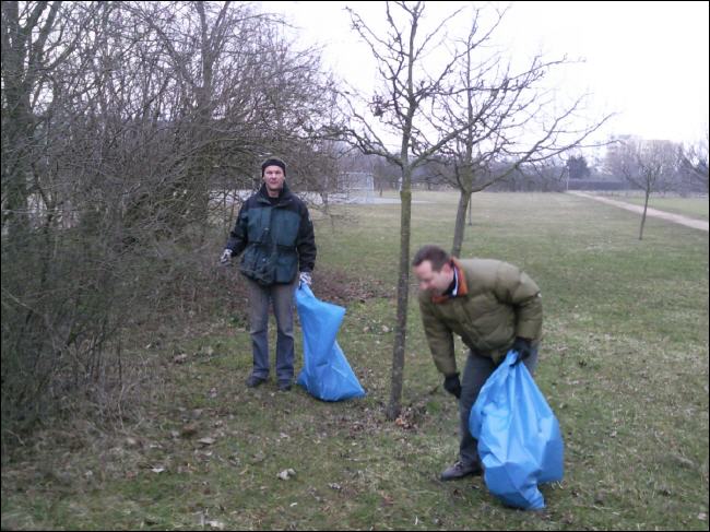 In dem Gebüsch am Bürgerhausparkplatz befand sich viel Dreck. Darum kümmerten sich Ulf Bliemeister und Dirk Lang. |
