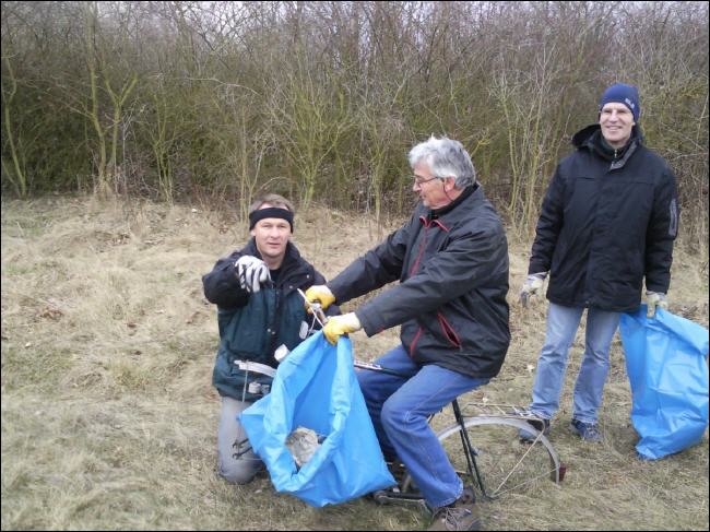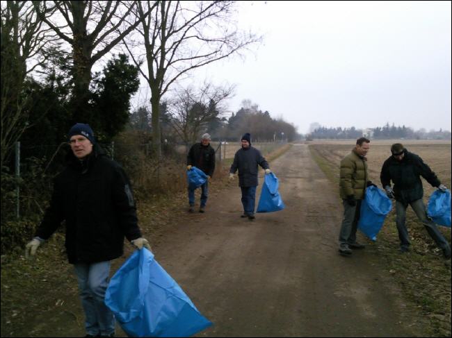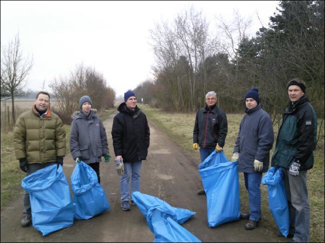 An der Landstraße angekommen, schwenkten wir wieder Richtung Gemeinde. Hier lohnte sich dann der Einsatz. Müll der achtlos aus dem Auto geworfen wurde, pflasterte unseren Weg. Eine Mülltüte nach der anderen füllte sich. Stefan Warnke schleppte sich mit dem Fahrrad ab. Ab hier vermisste er die Räder am Fahrrad. Zitat:“ So ein alter Rahmen ist schon ganz schön schwer“ |