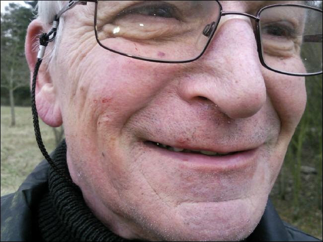 Nachdem die beiden wieder zur Gruppe aufgeschlossen hatten, wurde die erste Ausbeute bestaunt. Dazu gehörten auch die ersten Verletzungen. Unser Rentner Helge Rüggeberg wollte das letzte Stück Dreck aus dem Busch holen. Das ging natürlich nicht ohne Kratzer ab. |