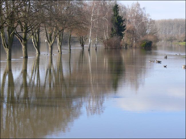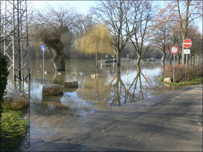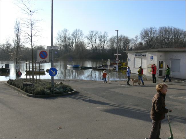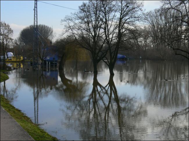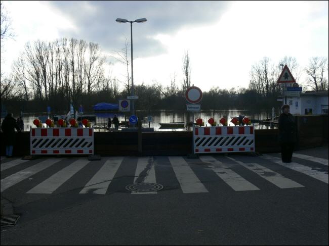 Also wurde nach rechts, Richtung unserer Treppe geschwenkt. Dort angekommen wurde ersichtlich, dass es kein Durchkommen zur unserer Treppe gibt. Es sei denn, man hat eine Watthose dabei. Dem war nicht so. Also ging es die Straße zum Hochwasserdamm hoch, um von dort Bilder unserer Treppe zu machen. |
