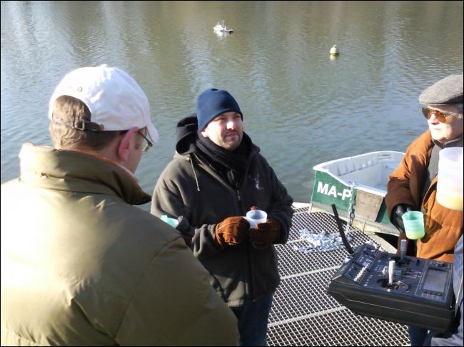Eine kleine Schar unerschrockener Modellbauer vom Modellbau-Club Mainspitze e.V. trotzt der Kälte und traf sich am Altrhein um Modellboot zu fahren. Gut ausgestattet mit warmer Kleidung, dicken Handschuhen und Mütze fand man sich gegen 10.30 Uhr an der Vereinstreppe ein und setzte gemeinsam die Boote ins Wasser. Obwohl die Ufer schon eine ca.5 mm dicke Eisschicht hatten, versuchte Wolfgang mit seinem Schlepper gleich, ob er hier was ausrichten konnte. Es knirschte heftig als sich der Schlepper durchs Eis arbeitete. Patrick musste mit seiner Rennpaula achtgeben nicht auf einzelne Eisschollen draufzukrachen. Damit wir auch länger aushalten konnten, hatte Karsten heißen O-Saft und Wolfgang heißen Pfefferminztee dabei. So konnte man dem kalten Wetter gut begegnen.