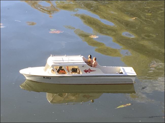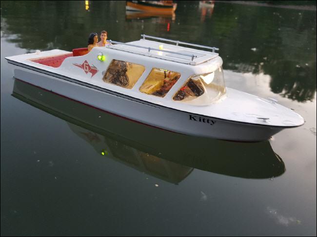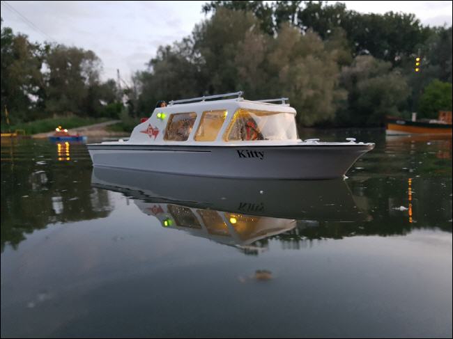 Modell: Die erste KITTY im Graupner-Programm kam 1968 auf den Markt. Sie hat einen Schaumplastik-Fertigrumpf. Die Aufbauten entstanden aus Balsa- und Sperrholz. Ich habe das Modell bei Ebay sehr sauber fertig gebaut erstanden. Als Antrieb verwende ich einen zeitgemäßen Brushless-Motor und eine 2,4GHz Steuerung. Die nautische Beleuchtung ist funktionsfähig mit LEDs bestückt. Zusätzlich hat das Modell eine Beleuchtung der Kajüte und der Plicht.