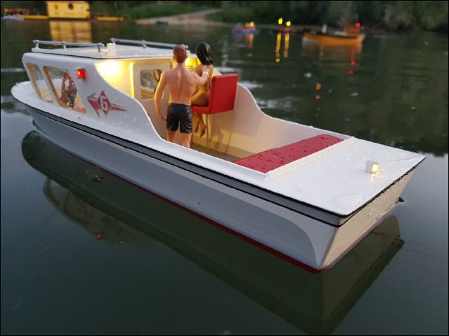 Daten: HerstellerGraupner Maßstab1:18 Länge470 mm Breite142 mm Höhe130 mm Tiefgang35 mm Verdrängung730 g MotorD-Power AL 28-14 1380KV ReglerD-Power Wave 25A BEC AkkuLitium 2S1P 1200 mAh Ruder-ServoMini-Standard Funktionen: Motor (Vorwärts, Rückwärts) Ruder Nautische Beleuchtung Kajüt- und Plicht-Beleuchtung
