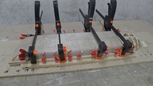 Montage der diagonalen Verstrebungen. Auf der Arbeitsplatte das Messingblech als Biegeschablone der Verstrebungen.